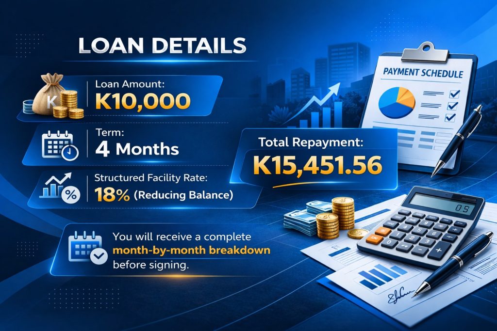 Primesave Loans Zambia Limited operates using a 18% structured facility rate applied on a reducing balance.